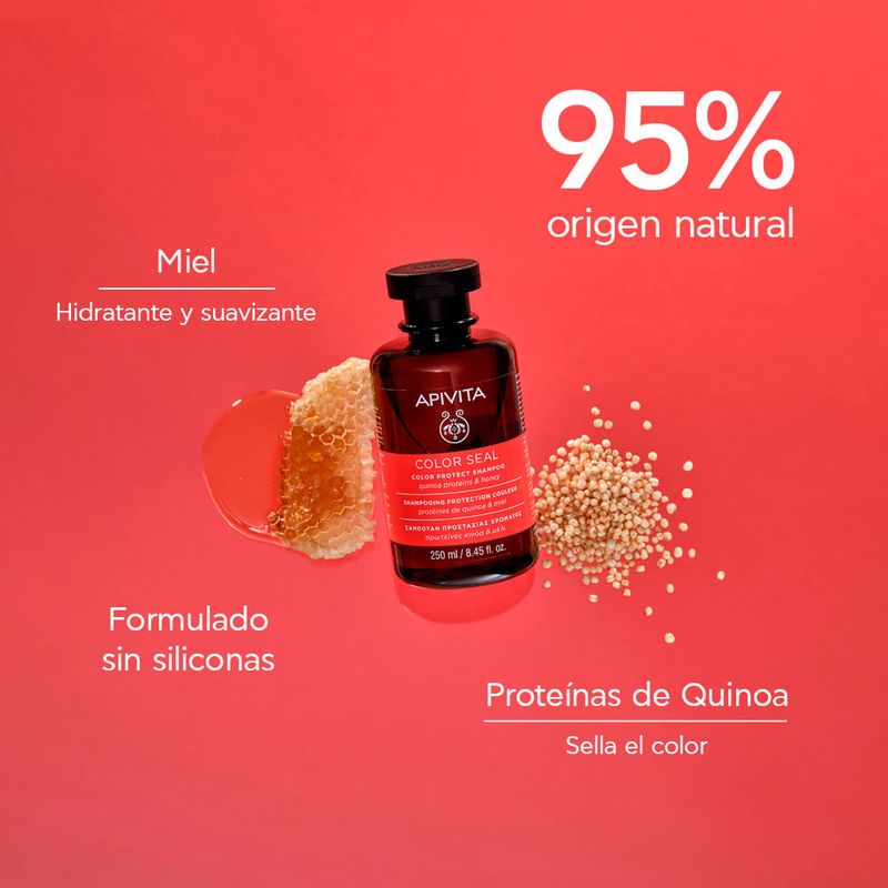 Beneficios | 1. Limpieza extra suave y delicada sin sulfatos respetando la flora natural del cuero cabelludo. 2. Potencia y mantiene la vitalidad del color, lo protege de la degradación y de la radiación UV gracias a las proteínas de quinoa. 3. Hidrata y ayuda a reparar el cabello dañado, a la vez que lo protege de las agresiones externas (contaminación y herramientas térmicas), con miel de tomillo y APISHIELD HS. |