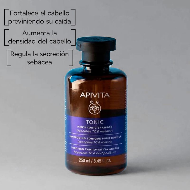 Champú anticaída para hombre de la gama tonificante de Apivita para la prevención y el tratamiento de la pérdida de cabello ayuda a controlar eficazmente la pérdida estacional o hereditaria y favorece el crecimiento saludable del cabello.