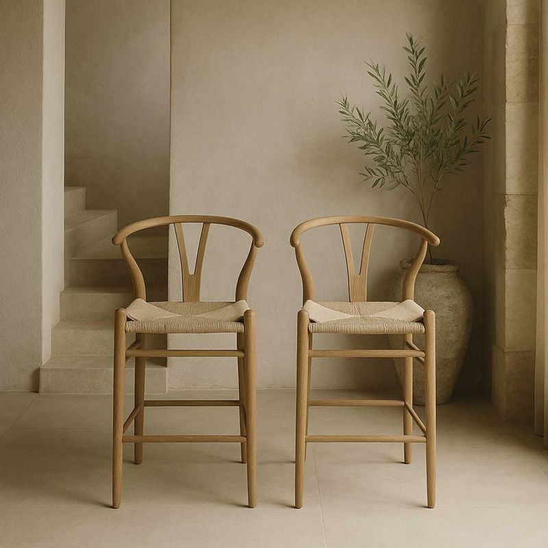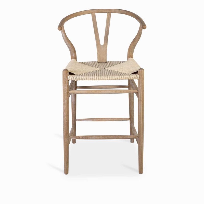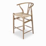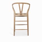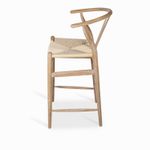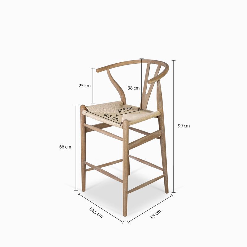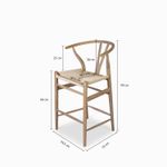 Silla de bar en madera con asiento tejido, de estilo clásico y atemporal, su altura la hace ideal para barras o islas de cocina. Su espaldar en U la hace cómoda y segura de usar.