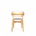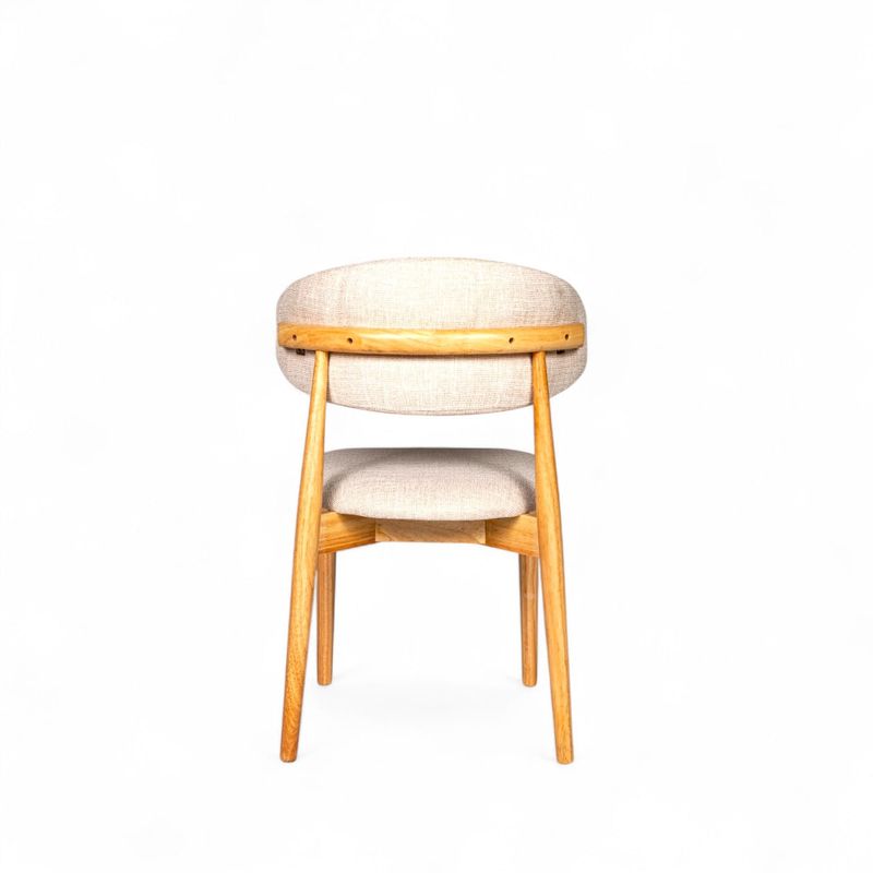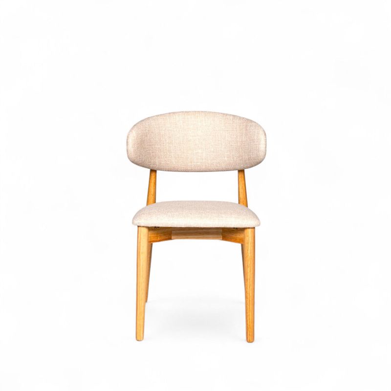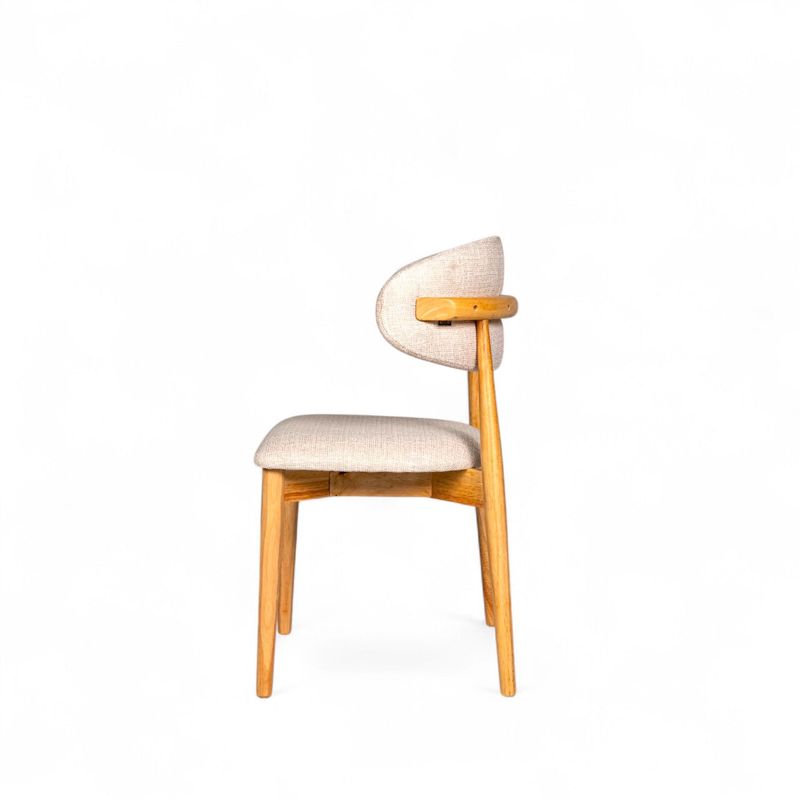 Silla para comedor de la colección Anton en color beige, con estructura y patas en madera con tapizado en lino, de estilo minimalista de ángulos inclinados. Esta silla de diseño moderno brinda comodidad y estilo.