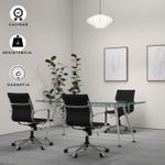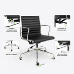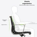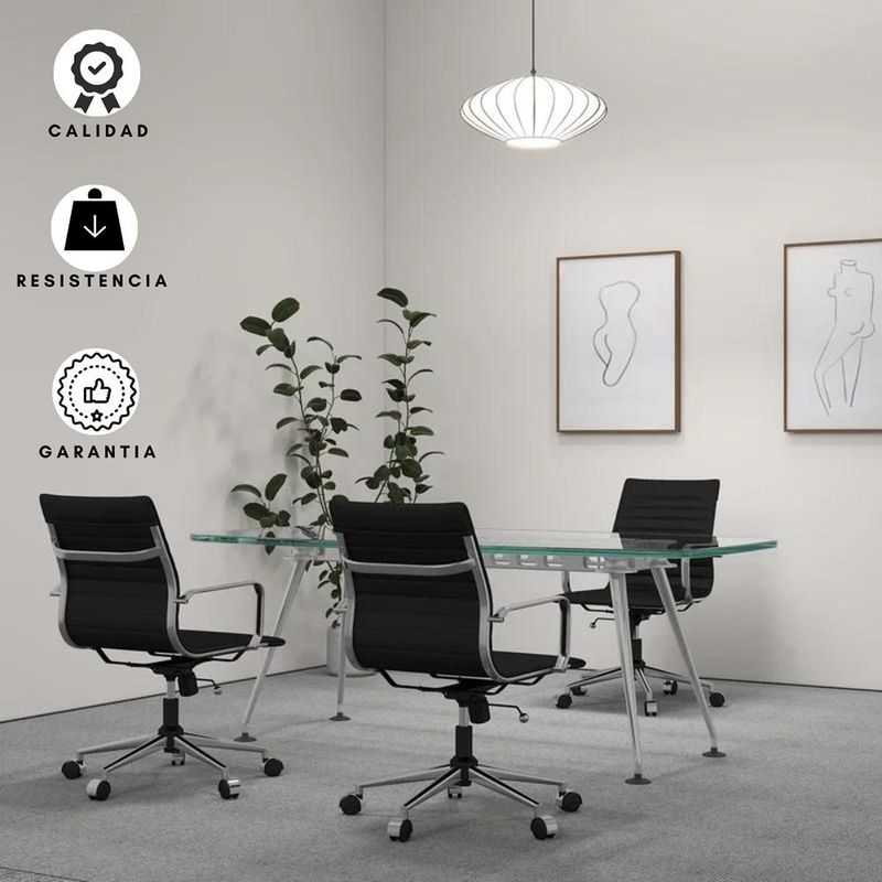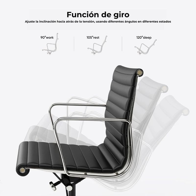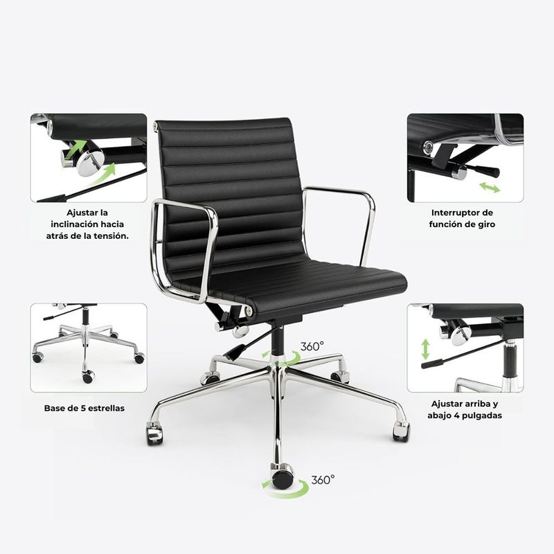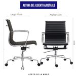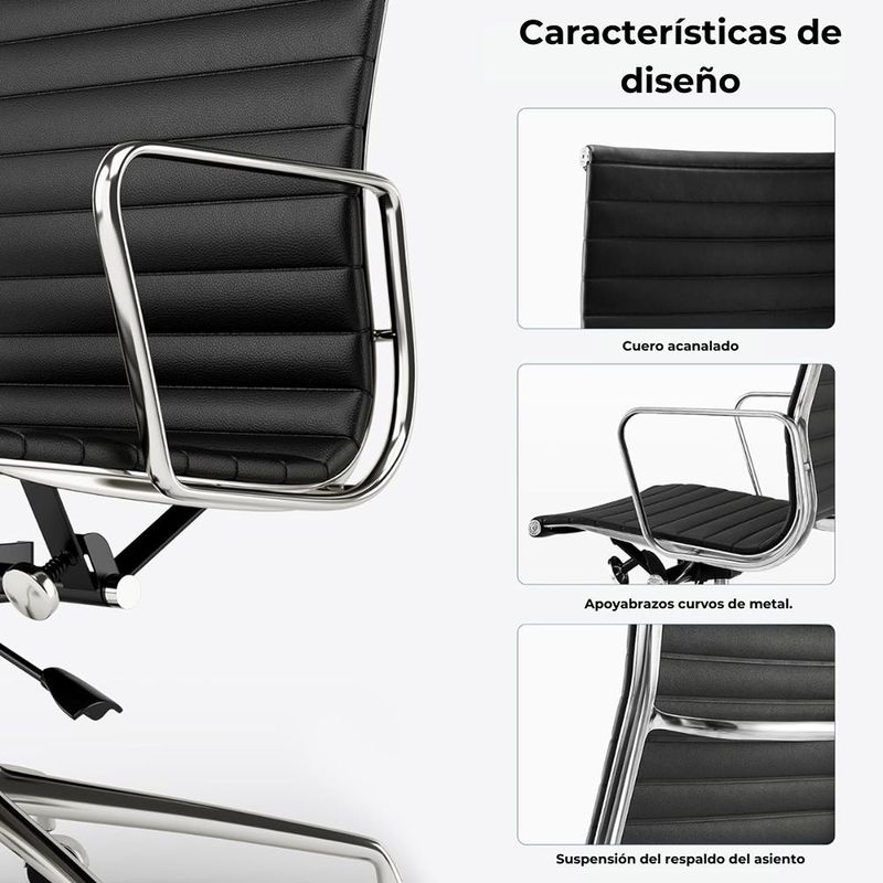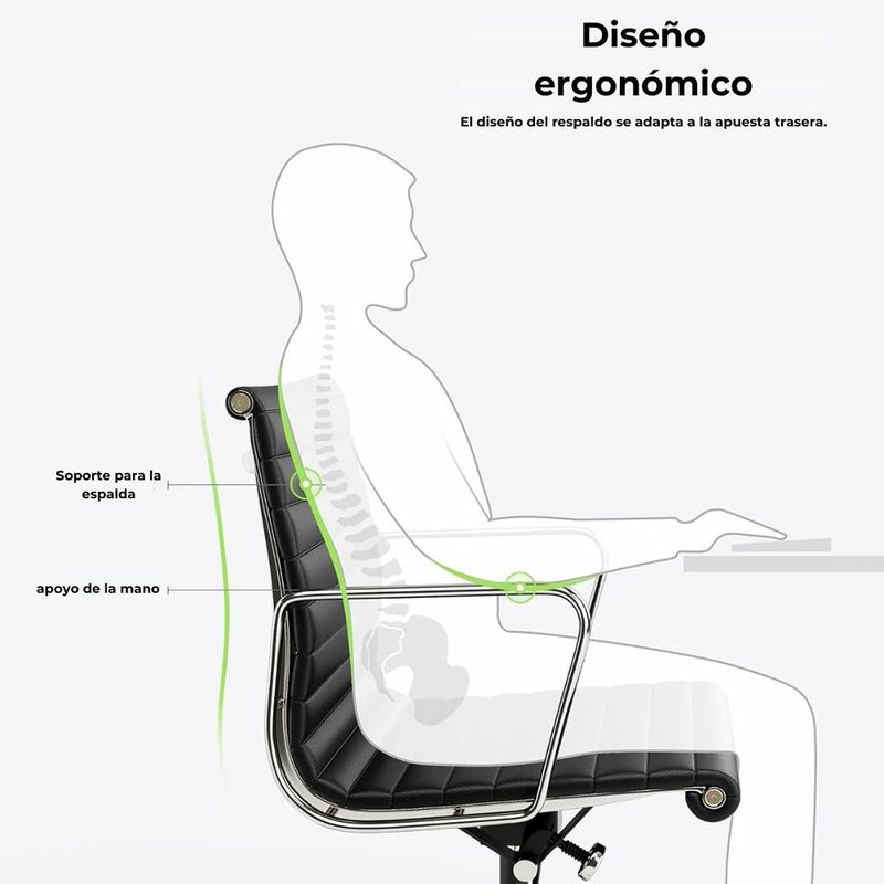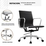 Silla ergonómica con espaldar acolchado tapizado en cuero sintético negro de excelente calidad. Sistema giratorio que permite posición. Con perilla de tensión y distención Asiento tapizado en cuero sintético Mecanismo basculante avanzado Ruedas de Nylon de 50mm Brazos en estructura cromada con abullonado en cuero sintético.