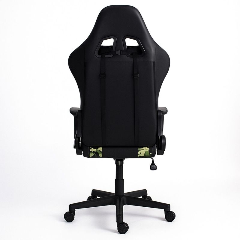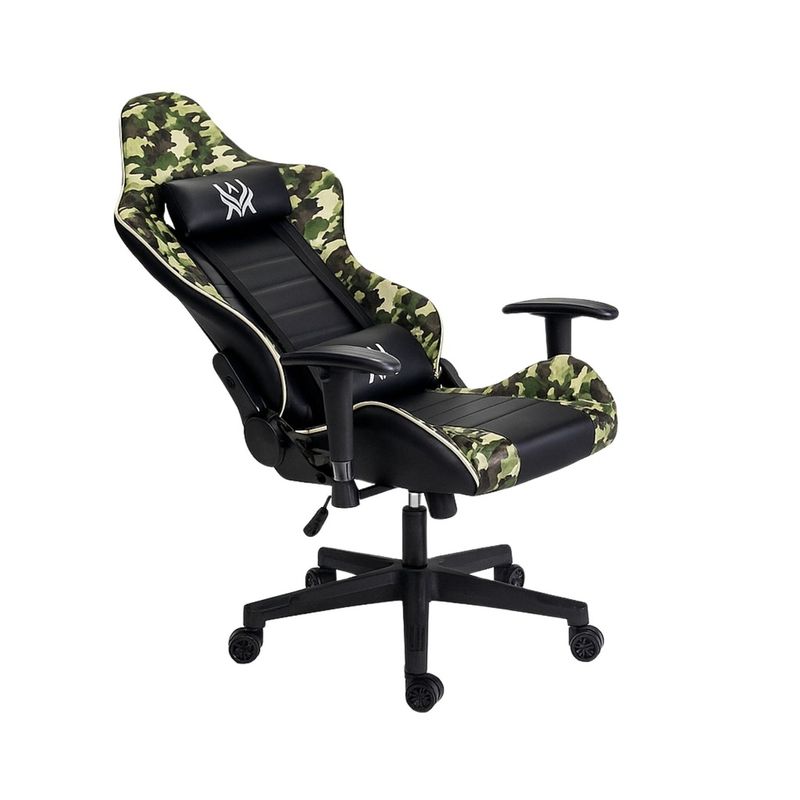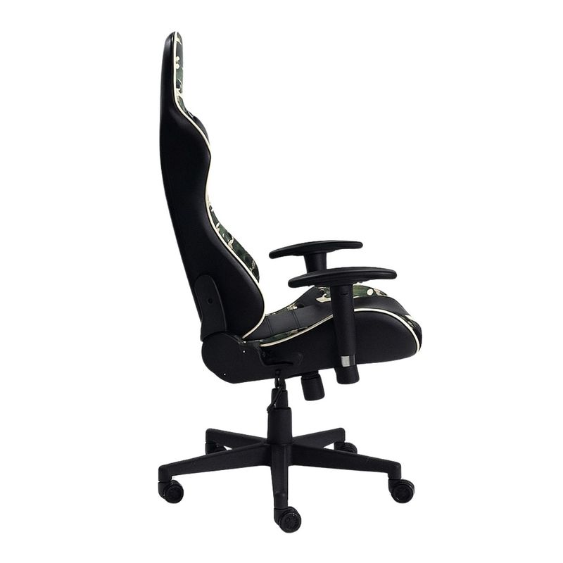 Materiales de alta calidad tapizada en cuero PVC adiciona diseño camuflado, incorpora soporte cervical y lumbar, reposabrazos 1D en polipropileno reforzado en color negro, reclinación hasta 180° del espaldar, sistema de ajuste en altura, base en polipropileno de 5 aspas con ruedas de silicona.