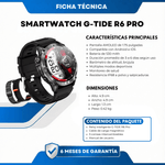G-TiDE R6 Pro con pantalla táctil completa de 1.43 pulgadas y resolución 466 x 466, diseño circular deportivo con doble botón funcional, conectividad Bluetooth 5.2 + 3.0, batería de 530 mAh, resistencia IP68, grosor de 1.3 cm, funciones de llamadas Bluetooth, sincronización de contactos, monitoreo de salud integral, oxígeno en sangre, barómetro, brújula, múltiples modos deportivos, control de música y cámara, clima, cronómetro, temporizador, alarmas, ciclo menstrual, carga magnética, compatible con Android y iOS mediante Fitbeing, peso aproximado 0.072 kg, dimensiones del producto 4.9 cm alto, 4.9 cm ancho, 1.3 cm largo, dimensiones de la caja 9.8 cm alto, 7.8 cm ancho, 12.2 cm largo, peso con caja 0.42 kg aproximado.