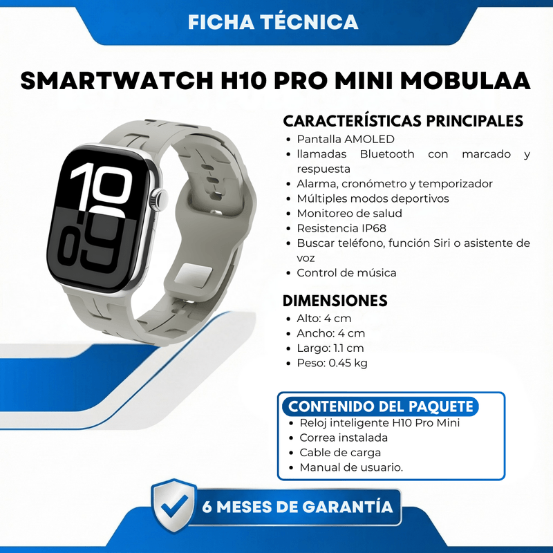 El Smartwatch H10 Pro Mini Mobulaa es el aliado perfecto para quienes valoran diseño minimalista, tecnología avanzada y control de su bienestar. Su tamaño compacto lo hace cómodo para todo tipo de muñeca, mientras su pantalla AMOLED real eleva la experiencia visual a un nivel superior. Ideal como regalo o para acompañarte en tu rutina diaria.