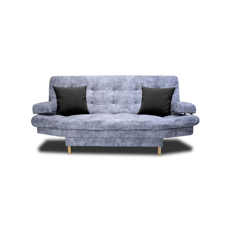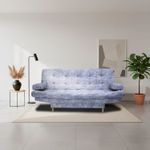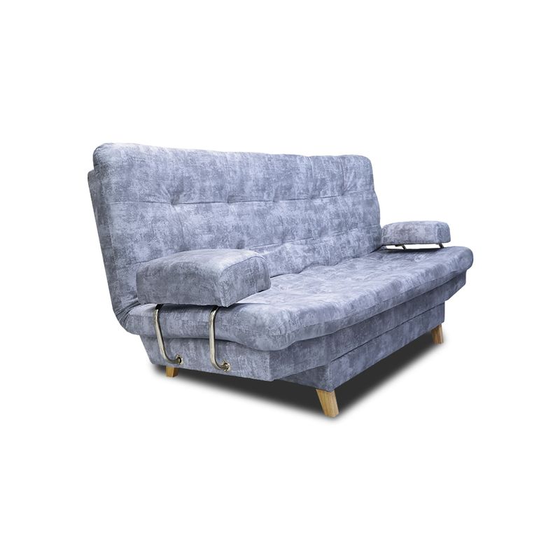 Este sofá cama tipo clic clac cuenta con 3 posiciones, permitiendo adaptarlo como sofá, reclinable o cama. Incorpora brazos que brindan mayor soporte y comodidad. Su estructura está fabricada en madera de pino inmunizada, complementada con espuma de alta densidad y patas de madera con antideslizante, aportando estabilidad y seguridad.