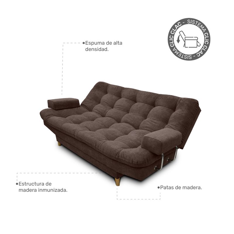 Sofá cama con diseño funcional, ideal para optimizar tus espacios. Tapizado en tela lino de excelente calidad, con descansa brazos ajustable para máximo confort. Patas terminado tipo madera.