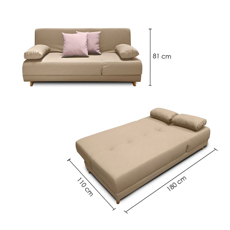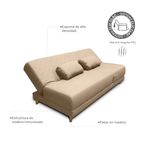 Sofá cama con diseño funcional de 5 posiciones. Ideal para optimizar tus espacios. Tapizado en anti rasguño PVC (No se pela, decolora o resquebraja). Máximo confort, patas en madera y antideslizante especial para evitar daños en el piso. Brazos tipo cojín acompañado de cojines decorativos.