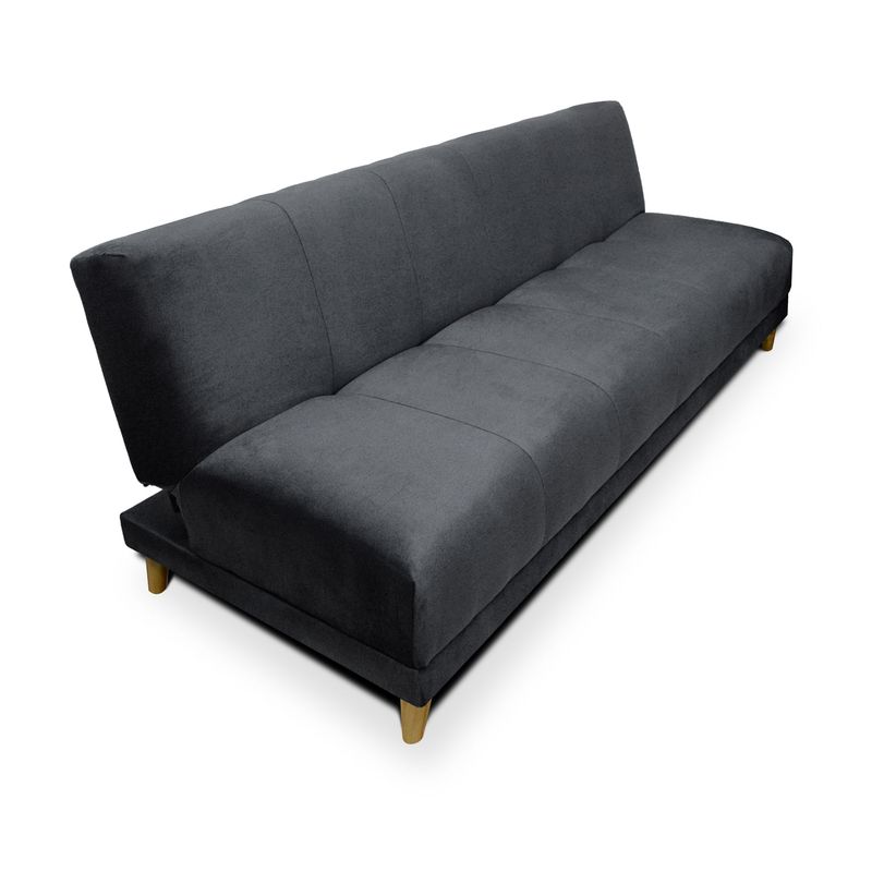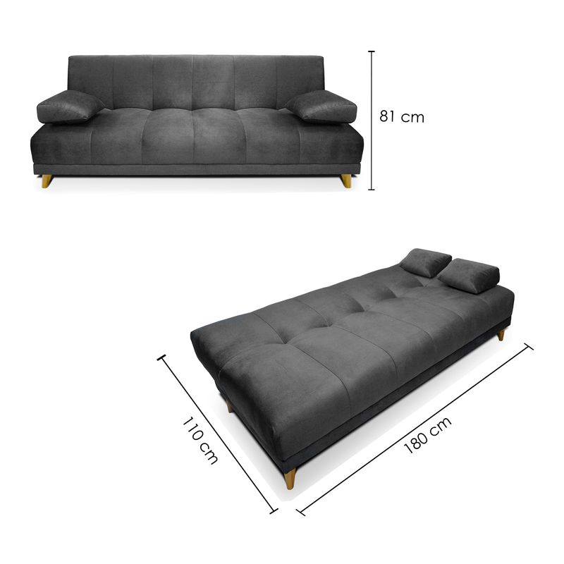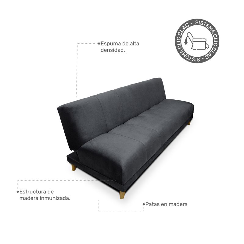 Sofá cama con diseño funcional, ideal para optimizar tus espacios. Tapizado en tela tipo piel de durazno con suavidad al tacto. Máximo confort con brazos tipo cojín, espumas de alta densidad y patas en madera.