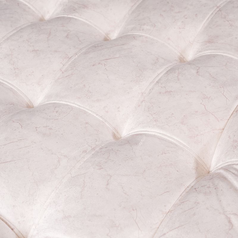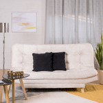 El Sofá Cama Valencia Marmol Marfil 3 PTOS 180x84x85 + Cojines, tiene una estructura de madera pino sanitizada para mayor durabilidad, relleno con espuma de alta densidad D26 y PENTA número 5 su colchoneta es de 10 cm que brinda confort y comodidad al sentarnos. Está tapizado con tela Poliéster fácil de limpiar. En modo cama el sofá es de tamaño semidoble. Cuenta con patas en madera pino color natural, pintadas con laca catalizada para acabado brillante. El sofá tiene 3 posiciones.
