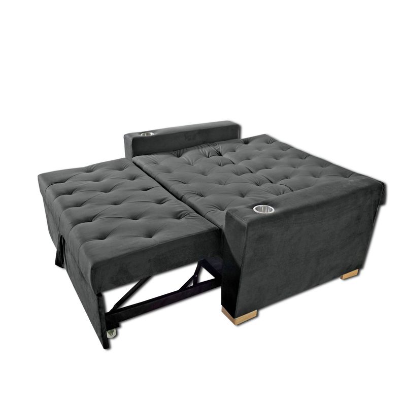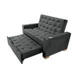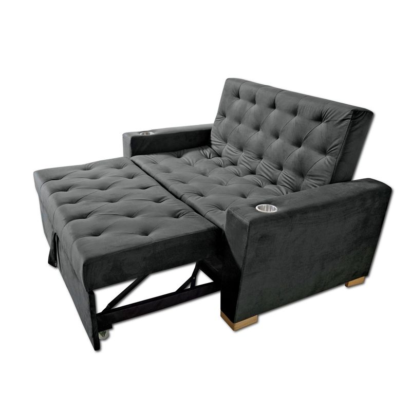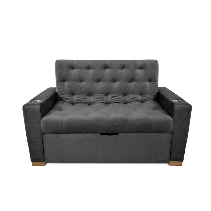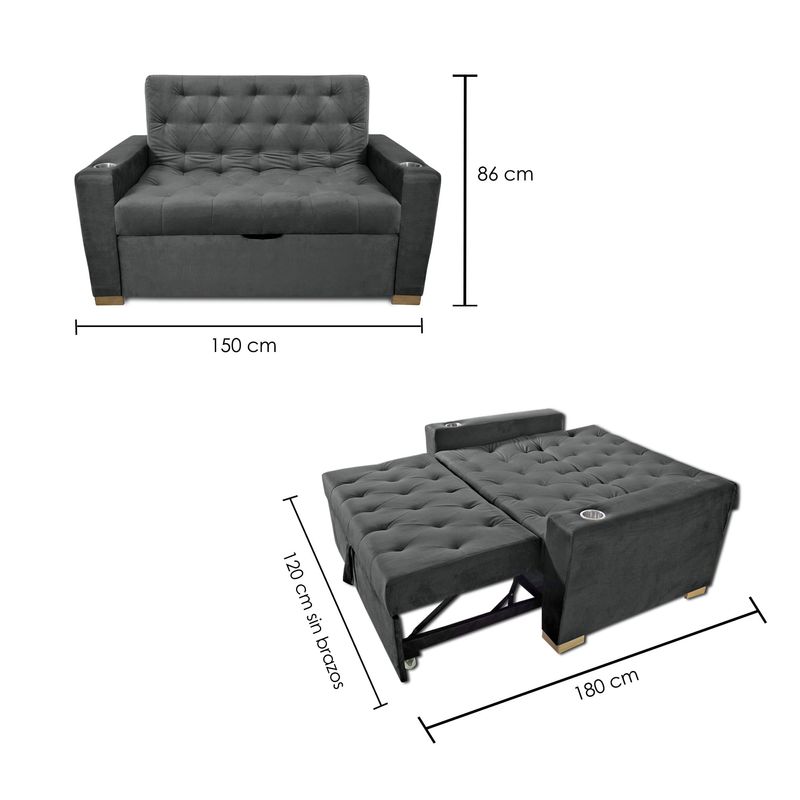 Sofá cama multifuncional 2 cuerpos, con detalles únicos de diseño, perfecto para completar el look de tu casa. Tapizado en tela tipo piel de durazno (microfibra), espumas de alta densidad, brazos reforzados para mayor estabilidad e incluye portavasos. Con un sistema de carrito que permite convertir en modo cama y gozar de muchos modos de uso. Medida útil modo cama: 120 x 180 cm.
