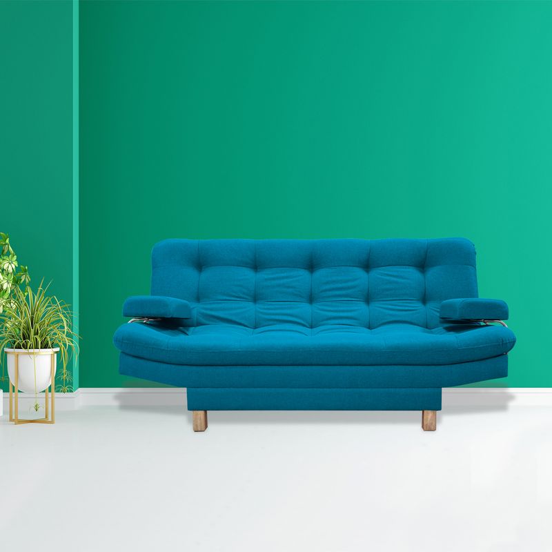 Sofacama 3 Posiciones 185x90, Tela tipo Lino color Turquesa, fresco al clima, suave al tacto y fácil de limpiar estructura, fabricado en Madera Pino inmunizada que aporta mayor resistencia y durabilidad, relleno de espuma de alta densidad, cuenta con brazos extraíbles para proporcionar más espacio a tus invitados, patas en madera con antideslizante que evitan ralladuras en pisos.