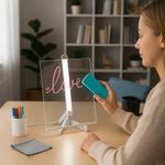 La Pizarra de Acrílico Borrable con Luz LED es el accesorio de escritorio perfecto para organizar tus tareas, dejar mensajes creativos o dar un toque moderno a tu espacio de trabajo o estudio. Su diseño transparente y elegante se complementa con una base de luz LED que ilumina tus notas o dibujos, creando un efecto visual llamativo. Es ideal para estudiantes, profesionales o cualquier persona que busque una forma interactiva y reutilizable de tomar notas.