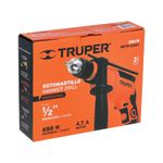 ROTOMARTILLO 1/2" 650 W PROFESIONAL TRUPER Marca Truper Código 15679 Clave ROTO-1/2A7 CARACTERÍSTICAS - Motor de 650 W montado sobre baleros de bolas para mayor vida útil y mejor desempeño - Selector de función taladro o rotomartillo con velocidad variable reversible - Mango auxiliar de plástico con giro de 360° para mayor comodidad y mayor control en el perforado - Varilla de control de profundidad - Para perforaciones en concreto madera y metal - Botón de uso continuo ESPECIFICACIONES - Broquero 1/2" 13 mm - Potencia 650 W - Velocidad 0 - 3 100 rpm - Golpes 0 - 50 000 gpm - Ø Perforación máxima en concreto: 1/2" 13 mm - Ø Perforación máxima en metal: 1/2" 13 mm - Ø Perforación máxima en madera: 1" 25mm - Tensión / Frecuencia 127 V / 60 Hz - Consumo 4.7 A - Ciclo de trabajo 30 minutos de trabajo por 15 minutos de descanso. Máximo diario 3 horas - Peso 1.8 kg - Empaque individual Caja INCLUYE - Mango auxiliar - Llave para broquero - Varilla de control de profundidad Con el taladro eléctrico Truper ROTO-1/2A7 podrás realizar múltiples tareas en diversas superficies de un modo práctico y sencillo. Su potencia de 650 W te ofrecerá gran capacidad de perforación. Tecnología de excelencia Su mandril de 13 mm te permitirá manipular fácilmente la herramienta de manera segura y precisa. Además su velocidad variable ofrece una gran experiencia de uso adaptada a tus necesidades y requerimentos. Versatilidad y eficiencia Utilízalo para las aplicaciones que desees. Al ser percutor y destornillador podrás explotar al máximo sus funciones y obtener exactitud y calidad.