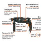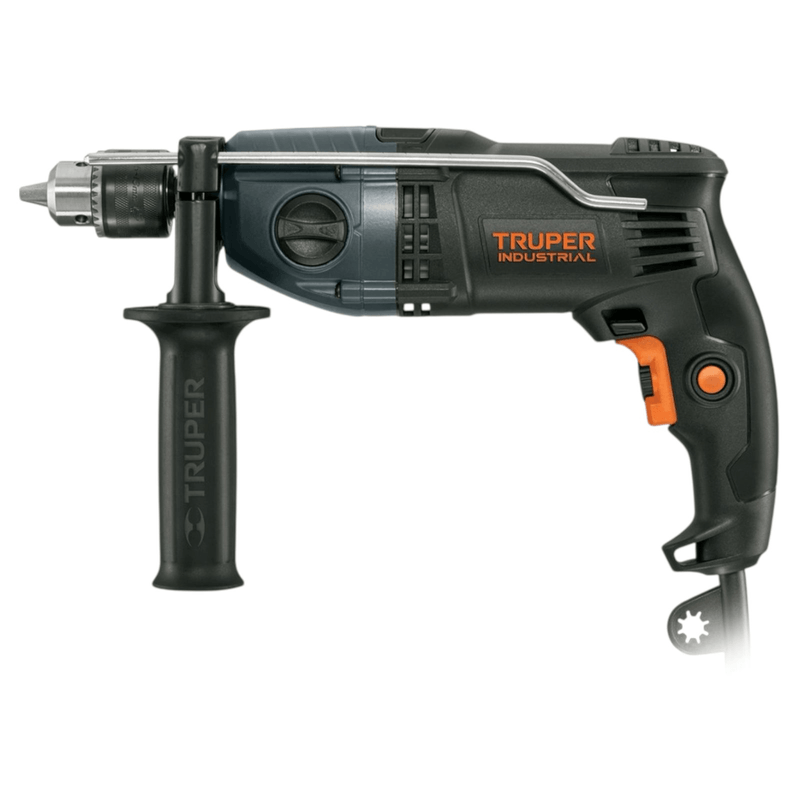 Con el taladro eléctrico Truper ROTO-1/2N7 podrás realizar múltiples tareas en diversas superficies de un modo práctico y sencillo. Su potencia de 900 W te ofrecerá gran capacidad de perforación. Tecnología de excelencia Su mandril de 13 mm te permitirá manipular fácilmente la herramienta de manera segura y precisa. Además su velocidad variable ofrece una gran experiencia de uso adaptada a tus necesidades y requerimentos. Versatilidad y eficiencia Utilízalo para las aplicaciones que desees. Al ser percutor y destornillador podrás explotar al máximo sus funciones y obtener exactitud y calidad. Rotomartillo industrial 1/2" 900 W Motor de 900 W montado sobre balero de bolas para mayor vida útil y mejor desempeño Caja de aluminio doble engranaje con 2 velocidades mecánicas para alta resistencia de uso Selector de función taladro o rotomartillo con velocidad variable reversible Mango auxiliar antiderrapante con giro de 360° para mayor comodidad y mayor control en el perforado Para perforación en concreto madera y metal Broquero 1/2" (13 mm) Potencia 900 W Tensión / Frecuencia 127 V / 60 Hz Consumo 7 A Velocidad variable reversible 0- 1 200 / 0- 3 300 r/min Golpes 0 - 20 400 / 0 - 56 100 gpm Ø Perforación en concreto 1/2" (13 mm) Ø Perforación en acero 1/2" (13 mm) Ø Perforación en madera 1" (25 mm) Ciclo de trabajo 50 minutos de trabajo por 20 minutos de descanso. Máximo diario 6 horas Peso 2.8 kg Empaque individual Caja