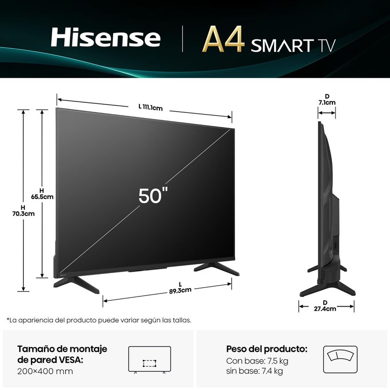 Disfruta de una experiencia visual impresionante con el Televisor Hisense A4NV FHD. Con una pantalla de alta definición, ofrece colores nítidos y detalles claros, perfectos para cualquier tipo de contenido. Su diseño moderno y elegante se adapta a cualquier espacio, mientras que sus funciones inteligentes te permiten acceder a tus aplicaciones favoritas y contenido en streaming con facilidad. Ideal para cine en casa o entretenimiento diario. Confiabilidad y calidad Hisense al alcance de tu mano.