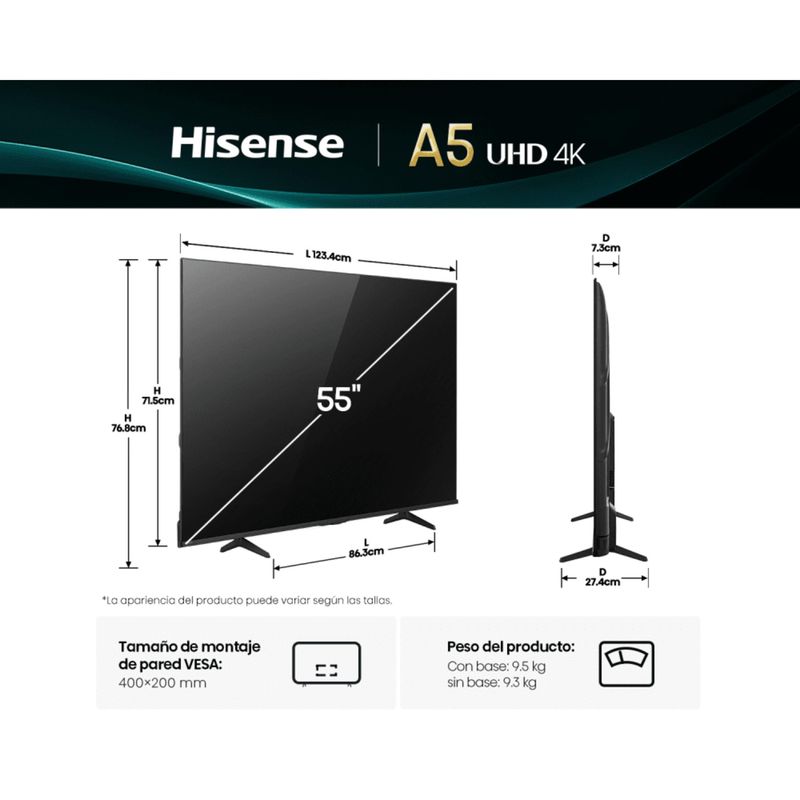 Disfruta una experiencia visual superior con el televisor Hisense 55A5NV de 55 pulgadas. Su resolución 4K Ultra HD (3840 x 2160) ofrece imágenes nítidas y colores vibrantes, mientras que la tecnología HDR con Dolby Vision optimiza el contraste y la intensidad de cada escena. Equipado con el sistema operativo VIDAA, tendrás acceso rápido y sencillo a tus aplicaciones favoritas como Netflix, YouTube, Prime Video y más. Su diseño delgado y elegante se adapta perfectamente a cualquier espacio del hogar. Además, incluye funciones avanzadas como Modo Cineasta y Modo Juego Plus, que ajustan la imagen para una experiencia auténtica y fluida. El sonido DTS Virtual-X proporciona un audio envolvente que te sitúa en el centro de la acción.