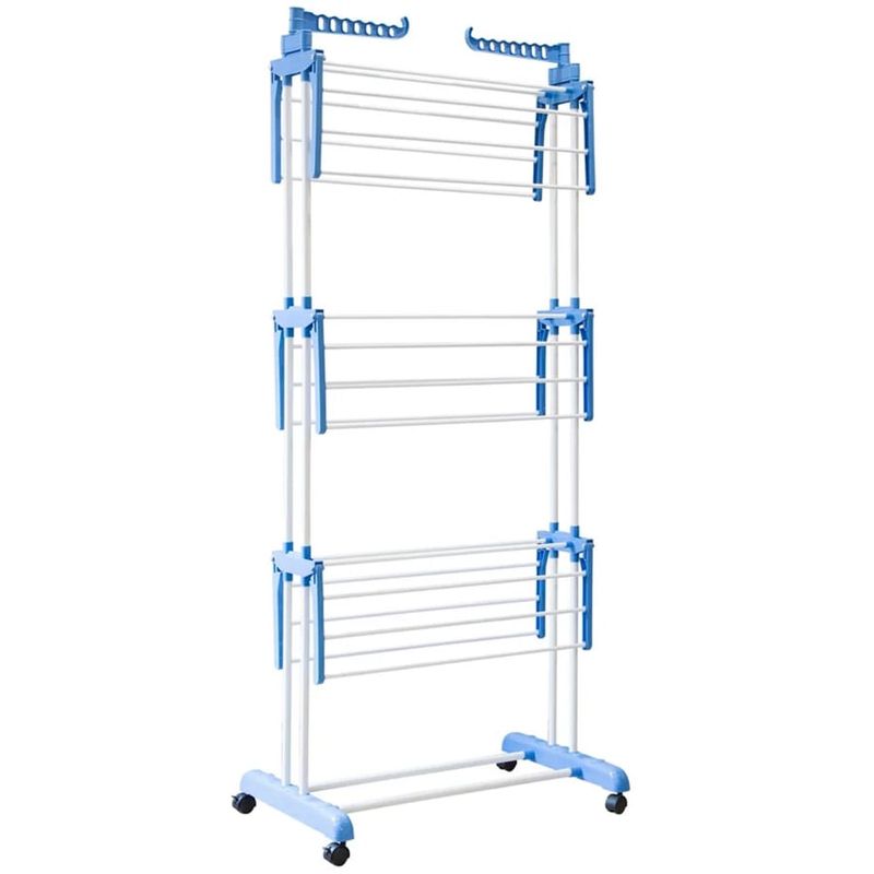 Tendedero de Ropa de 3 Niveles, ideal para colocar tu ropa y ordenarla, el soporte ocupa muy poco espacio, es fácil de armar y guardar, los soportes de la ropa son plegables lo cual hace más práctico su uso.