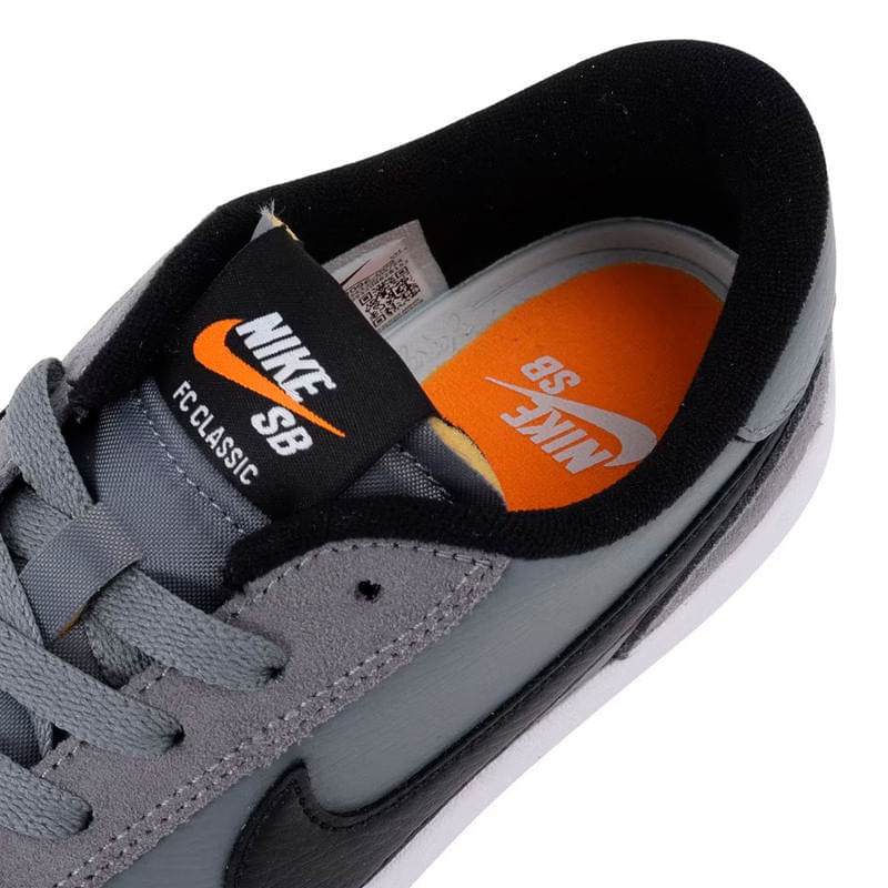 El Nike SB FC Classic (ref. 909096 003) es una versión renovada del modelo original de 2003. Combina materiales resistentes con buen confort para skate, destacándose por su plantilla acolchada Solarsoft, suelas de goma adherente, y diseño clásico con combinaciones de color que resaltan (gris frío, blanco y naranja vivo). Tiene detalles de lengüeta reforzada, construcción duradera para resistir impactos de skate, y materiales resistentes como gamuza y cuero sintético, además de estilo que trasciende el parque para adaptarse al uso cotidiano también.