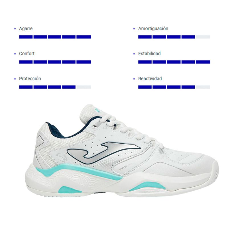 MODELO: Joma Master 1000 Mujer ¡Descubre los Tenis Joma Master 1000, diseñadas especialmente para mujeres que disfrutan del pádel y el tenis! Perfectas para jugadoras que practican de 2 a 3 veces por semana, estas zapatillas combinan ligereza y durabilidad, brindando una protección, comodidad y amortiguación excepcionales en cada partido. CARACTERÍSTICAS: Agarre Superior y Control Impecable: La suela se destaca por su agarre superior en la pista, permitiéndote moverte con versatilidad y control en cada deslizamiento. Gracias a su tracción impecable, podrás cambiar de dirección y detenerte rápidamente con total seguridad. Fabricada con caucho Durability: esta suela asegura una resistencia sobresaliente a la abrasión, ideal para el juego intenso. Protección y Comodidad Garantizadas: la mediasuela, elaborada con phylon flexible y ligero, ofrece una absorción de impactos óptima, asegurando que cada paso sea cómodo. La parte lateral más alta, gracias a la tecnología PROTECTION, proporciona un ajuste y sujeción perfectos, complementados con un tobillo y lengüeta acolchados de nylon y el cierre de cordones PERFECT FIT. Ventilación y Frescura en Cada Movimiento: la parte superior está confeccionada con material sintético PU de alta resistencia y flexibilidad, incorporando perforaciones VTS en zonas estratégicas para una ventilación óptima. Esto mantiene tus pies frescos y secos durante todo el juego, asegurando una comodidad constante. ¡No dejes pasar la oportunidad de elevar tu rendimiento en la pista! Con las Joma Master 1000, cada movimiento será una experiencia de flexibilidad y ligereza. ¡Prepárate para brillar en cada partido!