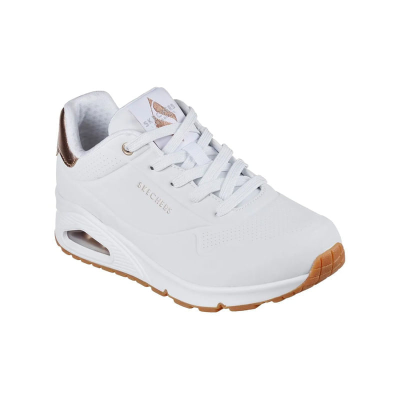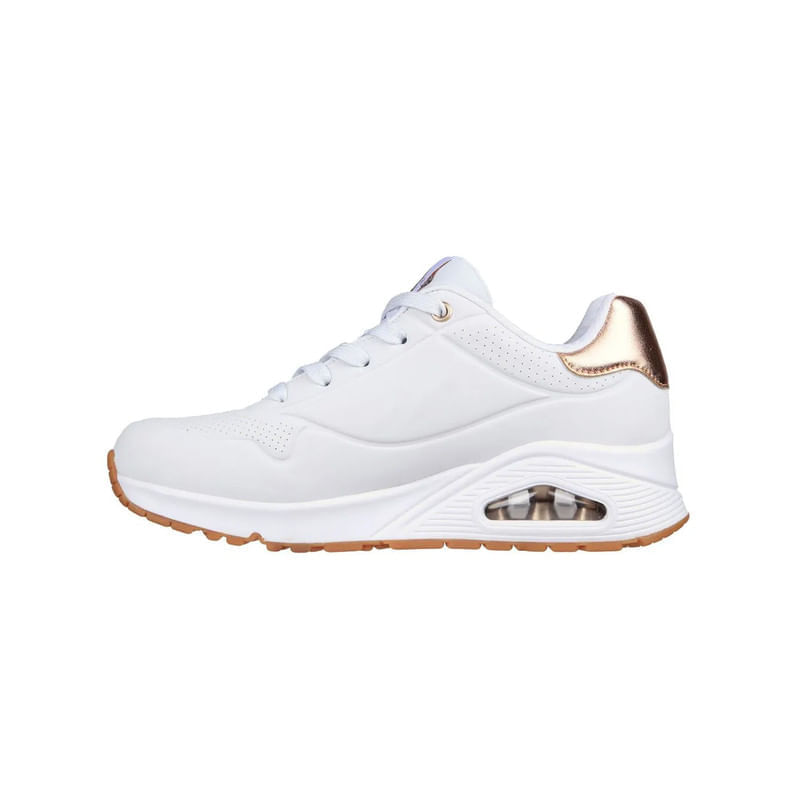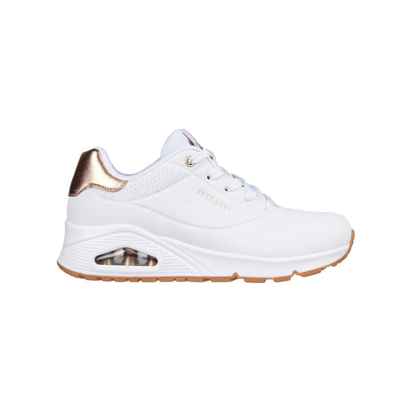 Las Skechers?UNO – Golden?Air (ref.?177094 WHT) están diseñadas para mujer y combinan un estilo urbano fashion con tecnologías de confort avanzadas. Su diseño se centra en una parte superior de durabuck sintético de acabado blanco con detalles dorados que aportan sofisticación. La media suela incorpora la cámara de aire visible de la tecnología Skech Air®, proporcionando una sensación de ligereza al caminar. En el interior, la plantilla Air Cooled Memory Foam® ofrece amortiguación inmediata y ventilación para un uso prolongado.