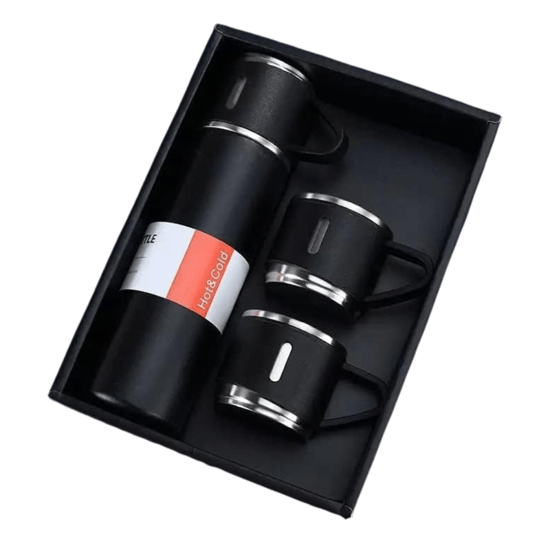 Lleva tus bebidas favoritas a todas partes con este práctico kit de termo + tres pocillos. Ideal para oficina, viajes, picnics o para regalar.