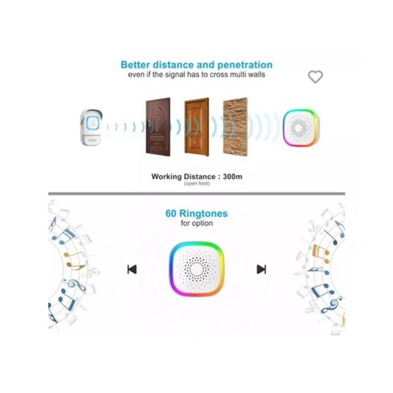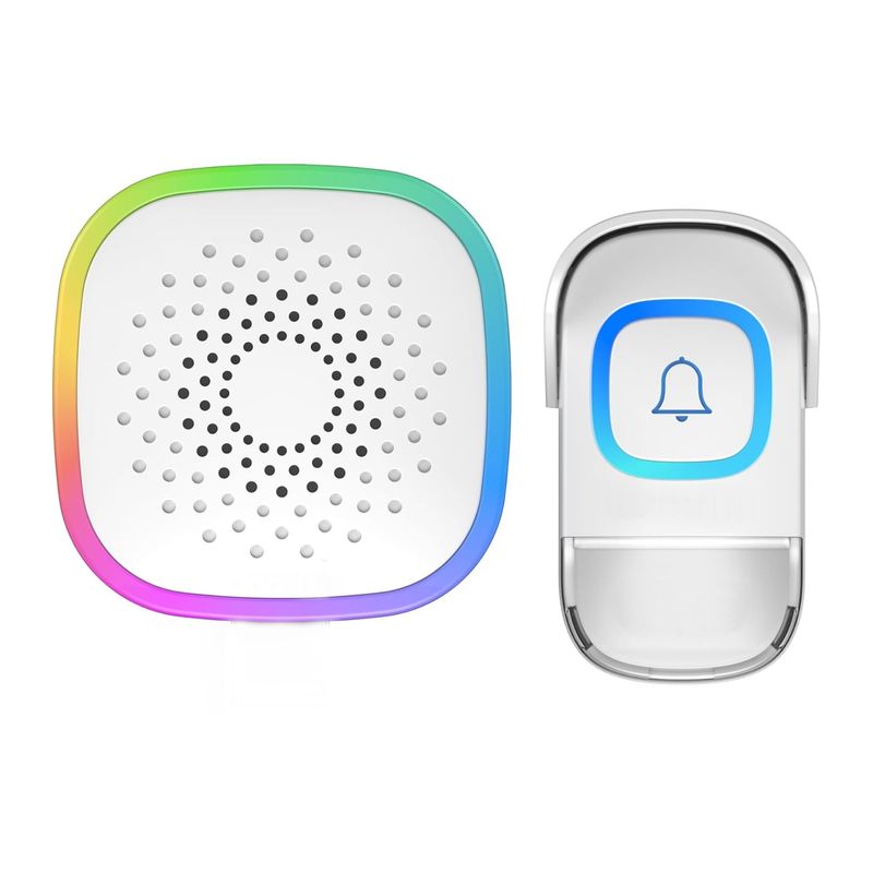 Función de memoria y modo silencioso: el timbre inalámbrico almacena la última melodía utilizada y el ajuste de volumen cuando se interrumpe el suministro de energía, sin necesidad de volver a ajustarlo. Silenciar el volumen del timbre inalámbrico no perturbará su descanso, trabajo o estudio. Las luces RGB de colores del timbre le recuerdan que alguien viene o alguien necesita ayuda.
