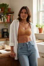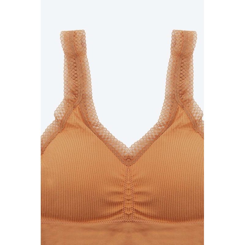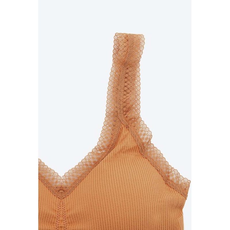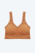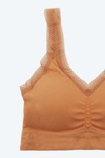 Top elaborado en poliamida, un material con un alto nivel de elasticidad, con tecnología Seamless que ofrece máxima comodidad. Esta tecnología, sin costuras laterales, permite que que sea una prenda versátil y cómoda, ideal para diversas actividades. Incorpora copas que se ajustan a las necesidades del cliente y tirantes amplios que proporcionan un soporte excepcional tanto al busto como a la espalda. Con una base media y escote triangular. Con textura acanalada que añade un detalle innovador y en tendencia. Cuenta con encaje en el escote y en las sisas que brinda feminidad.