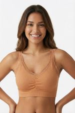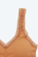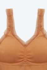 Top elaborado en poliamida, un material con un alto nivel de elasticidad, con tecnología Seamless que ofrece máxima comodidad. Esta tecnología, sin costuras laterales, permite que que sea una prenda versátil y cómoda, ideal para diversas actividades. Incorpora copas que se ajustan a las necesidades del cliente y tirantes amplios que proporcionan un soporte excepcional tanto al busto como a la espalda. Con una base media y escote triangular. Con textura acanalada que añade un detalle innovador y en tendencia. Cuenta con encaje en el escote y en las sisas que brinda feminidad.