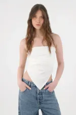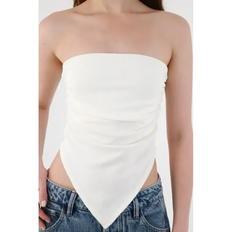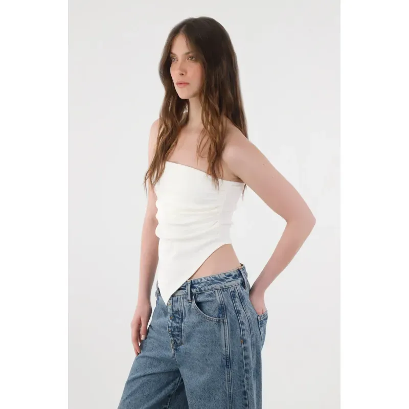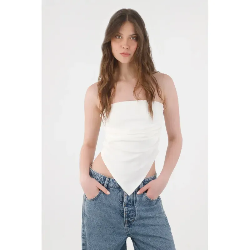Un pañuelo que se volvió top. Este top sin tirantes trae la actitud del pañuelo al día a día: el bajo en pico dibuja una línea vertical que estiliza y marca la cintura sin esfuerzo. El tejido suave con leve textura y toque de elastano se adapta al cuerpo y se siente cómodo durante horas; el blanco limpio ilumina y multiplica combinaciones de ciudad a noche. Además, el interior forrado suma soporte y seguridad para moverte libremente sin pensar.