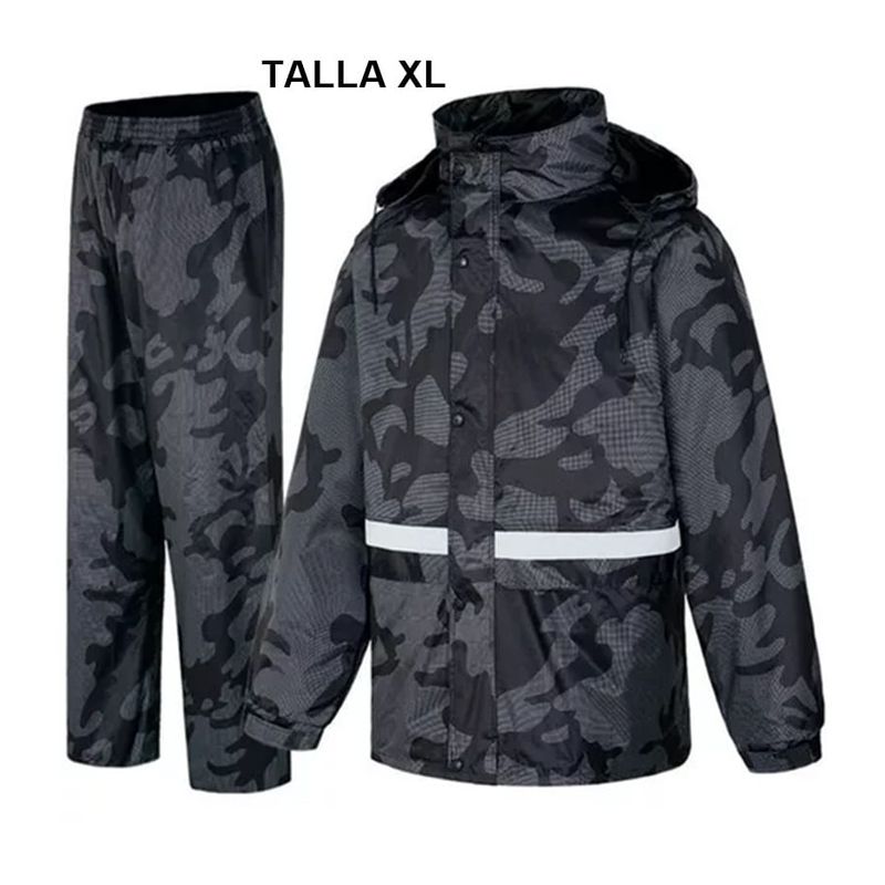Este traje impermeable camuflado tipo sudadera es ideal para quienes buscan estilo y funcionalidad al conducir en entornos urbanos.