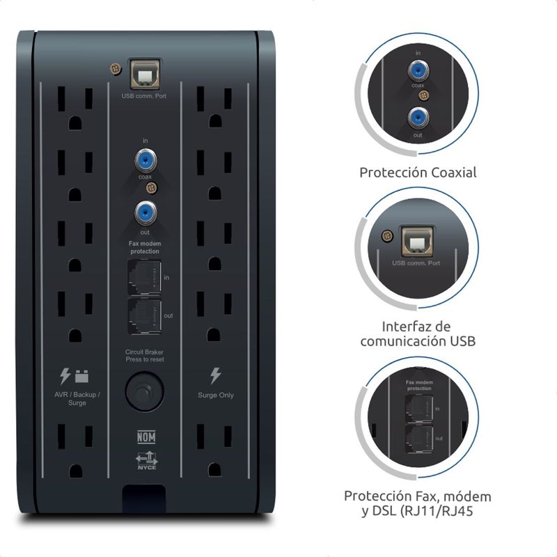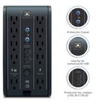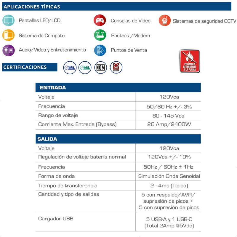 Tipo de Salida/Numero : 5 NEMA 5-15R con regulación AVR y respaldo de batería + 5 NEMA 5-15R con supresión de picos
