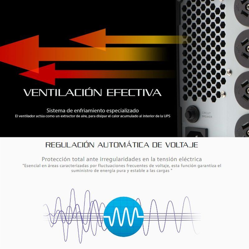 Margen de tensión (transferencia por baja tensión): 90VCA / 80VCA / 70VCA / 60VCA ± 3% (basado en un porcentaje de carga del 100%-80% / 80%-70% / 70%-60% / 60%-0%)