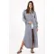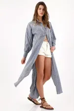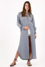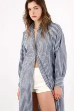 Este vestido camisero largo azul a rayas juega entre ciudad y frescura: el bordado de palmeras en el pecho aporta identidad instantánea sin perder la limpieza del diseño. La botonadura completa y el cuello mao refuerzan ese aire minimal, mientras las aberturas laterales y el ruedo redondeado suman movimiento y dejan ver sutilmente las piernas. Mangas largas con puños abotonados y un fit relajado en tejido de poliéster para una caída ligera que acompaña tu ritmo diario.