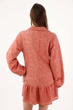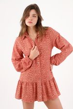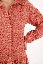 Broderie con actitud urbana. Este vestido camisero corto de TNS combina un calado geométrico en 100% algodón con un tono terracota que resalta sin esfuerzo: textura que suma carácter y una vibra fresca de ciudad. La botonadura frontal y el cuello clásico afinan el aire casual–pulido, ideal para pasar del plan diurno a la noche. La manga larga con puño suavemente recogido añade volumen cómodo, mientras el volante en el bajo crea movimiento fluido en cada paso. Además, forro 100% viscosa para una caída agradable sobre la piel; un verdadero vestido broderie terracota pensado para sentirse libre.