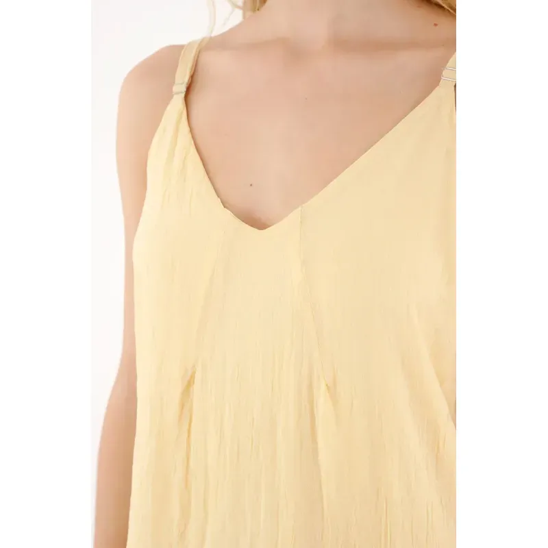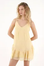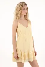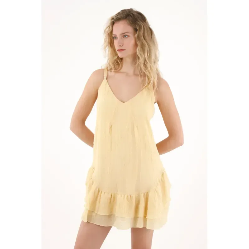 Este vestido para mujer está diseñado con una silueta en A que favorece la figura y aporta movimiento natural en cada paso. Su escote en V crea un look delicado y estilizado, mientras que las tiras regulables permiten ajustar el fit a tu medida para mayor comodidad. Los boleros en el ruedo añaden un toque romántico y sutil que eleva la prenda sin esfuerzo.