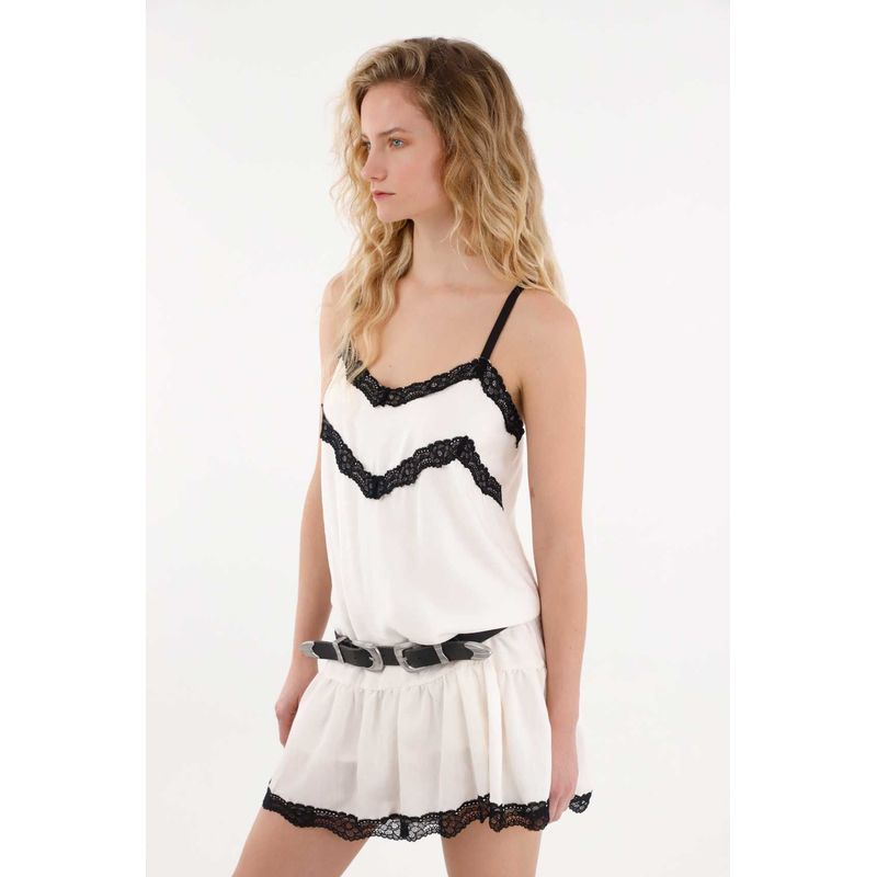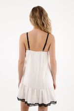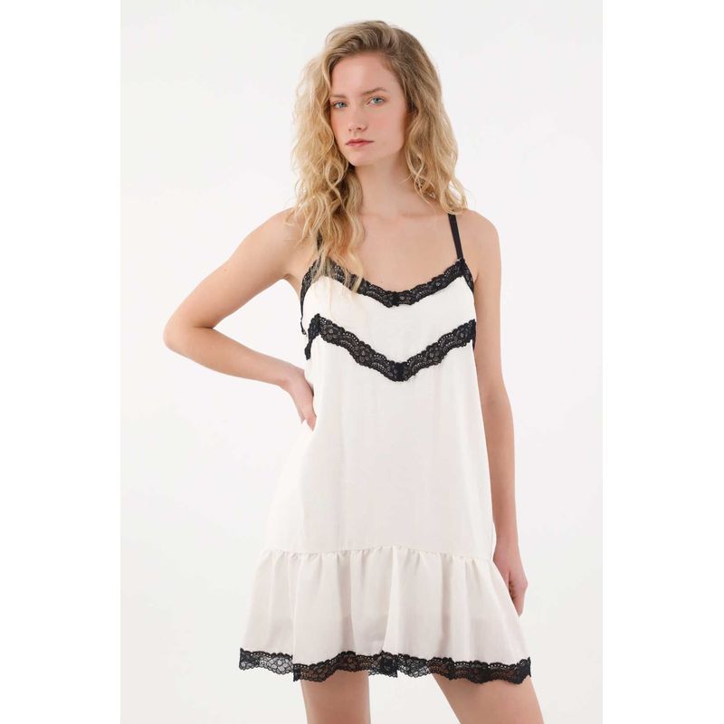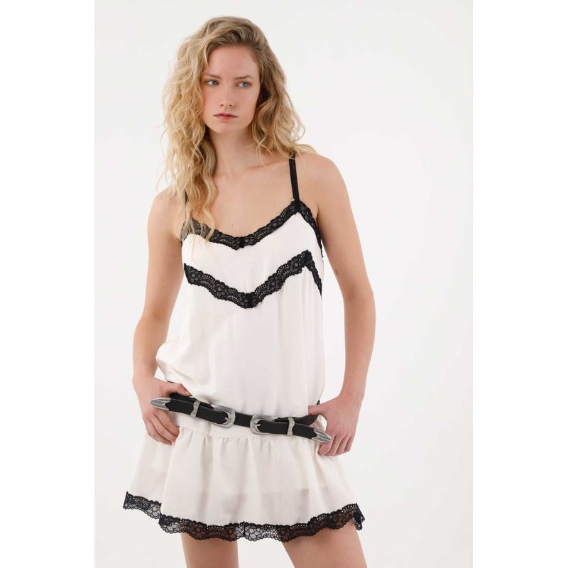 Este vestido corto está confeccionado en una tela liviana que cae con suavidad y fluidez, ideal para los días cálidos o para looks casuales con un toque romántico. Su escote en V estiliza y alarga la figura, mientras que las tiras graduables permiten un ajuste perfecto a tu medida. El bolero en el ruedo añade un movimiento encantador, y los detalles de encaje en contraste elevan la prenda con un acabado delicado.