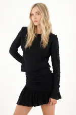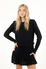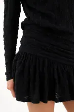 La blonda le da textura y un acabado delicado, mientras el fajón drapeado marca la silueta de manera favorecedora. El bolero en el ruedo suma movimiento y dinamismo, y las mangas largas equilibran el look con un contraste elegante. Perfecto para combinar con tacones minimal en un evento especial o con botas altas para un styling más arriesgado.