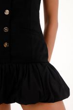 La silueta ajustada en el superior contrasta con la falda tipo globo, creando un balance ideal entre formalidad y frescura.