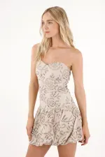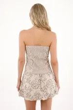 El strapless potencia el escote y equilibra la falda tipo globo, una de las siluetas más hot de la temporada. Su construcción en ojalillo añade un guiño femenino y artesanal, ideal para llevar con sandalias delicadas o botas trendy para un contraste moderno.