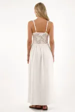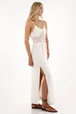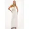De largo completo, con tirantes delgados y diseño fluido que estiliza la silueta, confeccionado en mezcla de materiales que elevan el look con contraste visual.