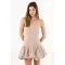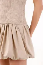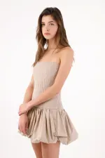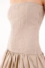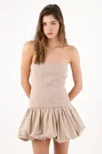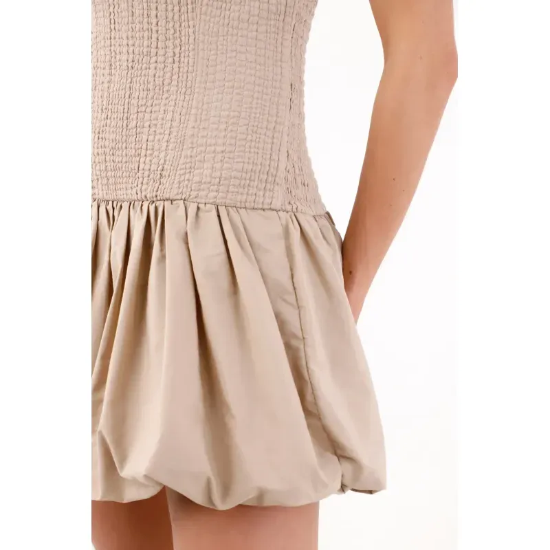 Este vestido mini strapless captura una vibra urbana y fresca: el torso texturizado y al cuerpo dibuja una línea limpia que enmarca hombros y clavículas, mientras la falda globo con pliegues marcados crea un efecto abombado con movimiento. El color beige arena funciona como un neutro contemporáneo que combina sin esfuerzo y deja que la silueta sea la protagonista. En algodón, su acabado se ve nítido y natural para tus planes del día a la noche.
