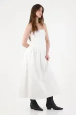 Textura que respira, silueta que flota. Este vestido midi de TNS en 100% algodón reinterpreta el ojalillo con un acabado limpio y actual. El forro también en algodón aporta cobertura sin perder frescura, perfecto para el calor. El top sin tirantes dibuja una línea pulida que enmarca hombros y clavículas, mientras la cintura con frunces se abre a una falda amplia que acompaña cada paso con movimiento ligero. El blanco luminoso suma versatilidad y un aire natural que va del día a la noche con cero esfuerzo.