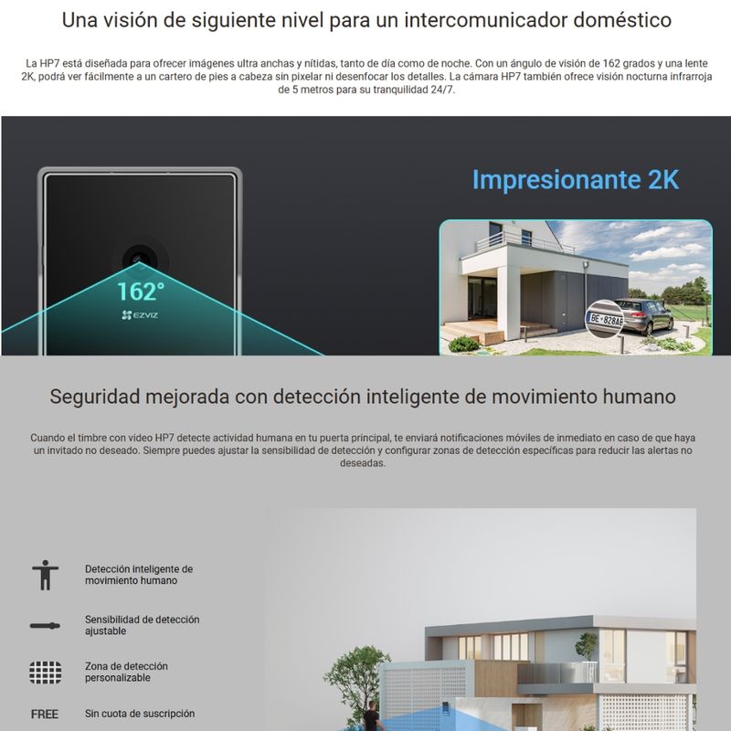 Es hora de actualizar su antiguo intercomunicador para que esté conectado a internet, sea accesible remotamente y controlable mediante una aplicación. El primer videoportero HP7 de EZVIZ maximiza la comodidad para que los propietarios puedan ver, hablar y permitir el acceso a las visitas incluso si no están en casa. También mejora la seguridad del hogar, ya que la cámara y el teléfono exterior 2 en 1 permiten grabar videos con una claridad de 2K y detectar personas con notificaciones móviles en tiempo real.