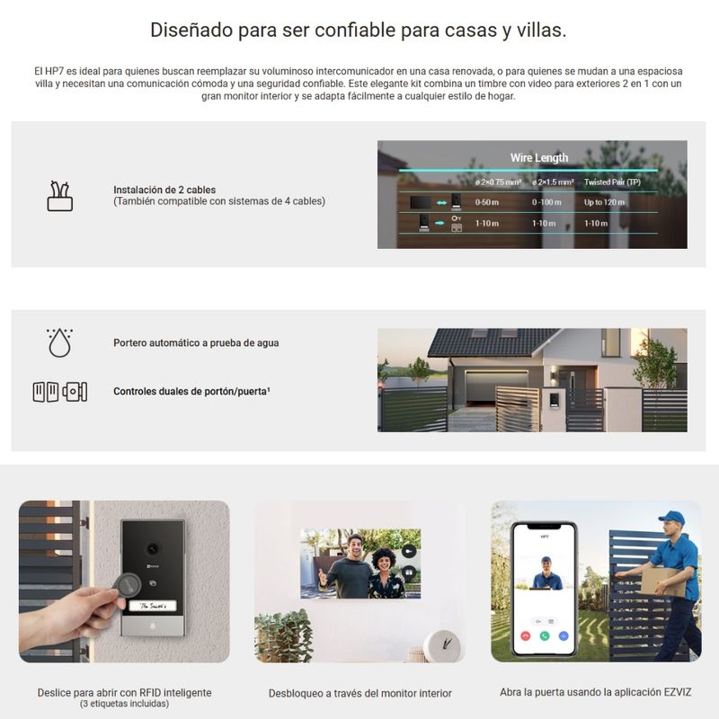 El HP7 es ideal para quienes buscan reemplazar su voluminoso intercomunicador en una casa renovada, o para quienes se mudan a una espaciosa villa y necesitan una comunicación cómoda y una seguridad confiable. Este elegante kit combina un timbre con video para exteriores 2 en 1 con un gran monitor interior y se adapta fácilmente a cualquier estilo de hogar.