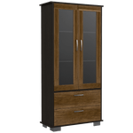 Vitrina, con 2 cajones, 2 puertas de vidrio, 3 entrepaños, manijas y patas metálicas.