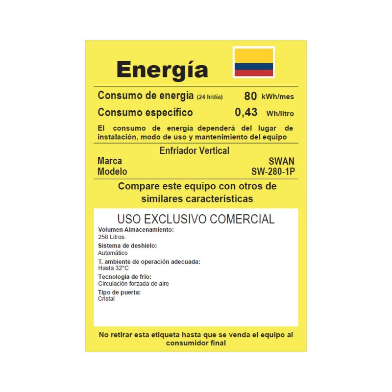 La Vitrina vertical SWAN SW-280-1P está diseñado para uso comercial con un rango de temperatura entre 1 °C y 10 °C y capacidad de 258 litros netos. Equipa un sistema de refrigeración por ventilador que distribuye el frío de forma uniforme, descongelación automática y bandeja de auto-evaporación para fácil mantenimiento. Incorpora control mecánico con display de temperatura, iluminación LED, 4 estantes ajustables y cerradura con llave, además de aire caliente anti-condensación que asegura máxima visibilidad. Una solución robusta y confiable para la exhibición de productos refrigerados.