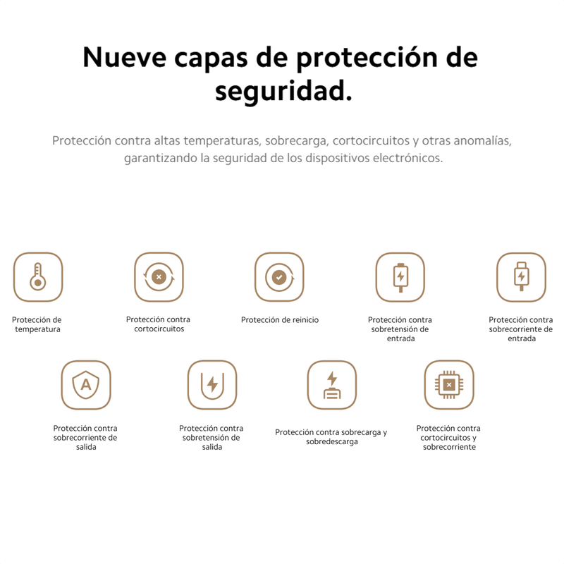 Protección contra altas temperaturas, sobrecarga, cortocircuitos y otras anomalías, garantizando la seguridad de los dispositivos electrónicos.