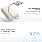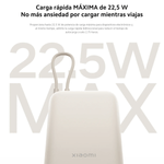 Viene con un cable de carga rápida bidireccional tipo C de 22,5 W, lo que simplifica el viaje al hacer más fácil la carga de dispositivos electrónicos y del propio banco de energía.