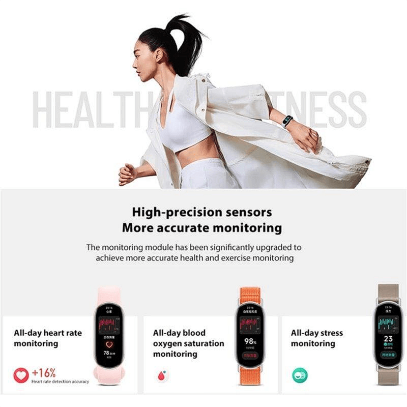Los sensores incorporados de la Smart Band 9 monitorean la frecuencia cardíaca y el oxígeno en sangre un 10% más eficientemente que su predecesora, incluyendo un notable nivel de precisión mejorado a la hora de realizar un seguimiento de las horas de sueño. Ante cualquier anomalía, la pulsera vibrará gracias a su motor incorporado con 20 modos de vibración diferentes incluidos.
