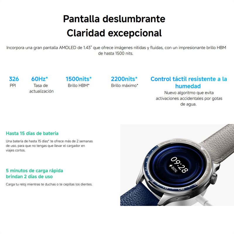 Resolución: 466 x 466 píxeles, PPI 326 Pantalla AMOLED de 1.43" Frecuencia de actualización: 60Hz* *La frecuencia de actualización puede variar en diferentes interfaces. Consulta el escenario de uso real. Brillo: HBM 1500 nits *El brillo HBM es el máximo brillo cuando toda la pantalla está iluminada.
